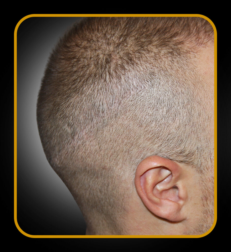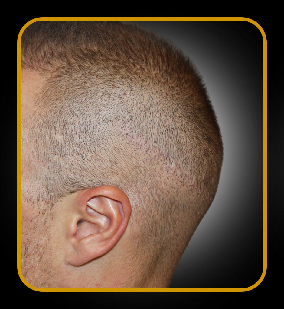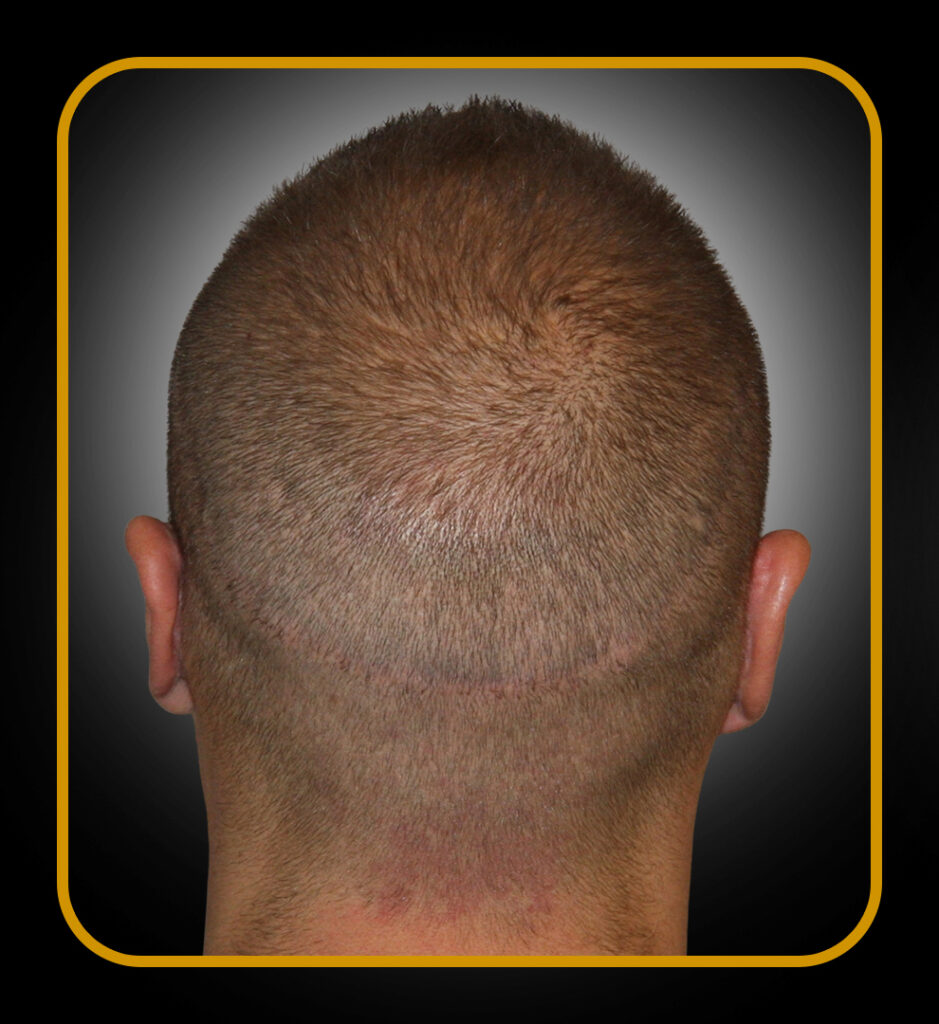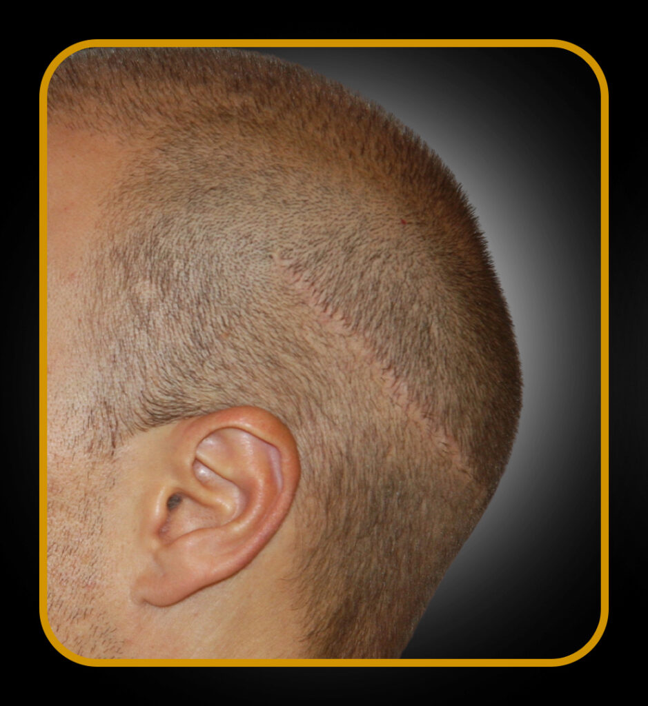 This young male patient enjoyed keeping his hair short—but doing so revealed a visible and unsightly strip scar from a previous transplant. It was a daily reminder of a decision he regretted.