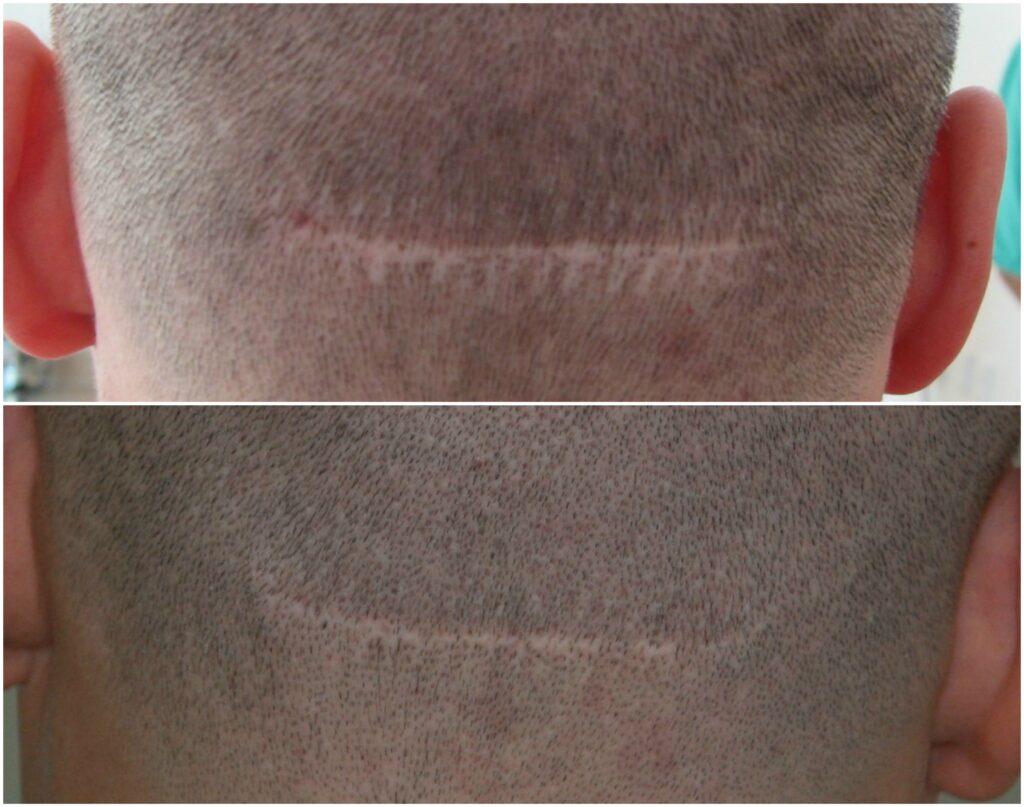 After just one session with Dr. Hussain, the scar became barely noticeable—even though his hair is shorter in the after-photos than before. That’s right: the scar is less visible, despite the shorter haircut.